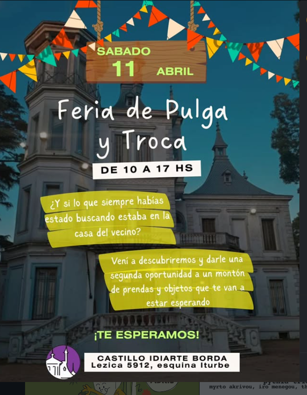 Feria de Pulgas y Trueque ♻️ ¡Dale una segunda oportunidad a objetos únicos y encuentra lo que tanto buscabas! 📅 Cuándo Próxima fecha: Sábado 11 de abril De 10:00 a 17:00 hs. 📍 Qué vas a encontrar Stands variados: Ropa 👕, calzado 👞, cuadros 🖼️, juguetes 🧸 y joyería 💍. Modalidad: Venta directa y trueque (intercambio). Propósito: Consumo responsable y economía circular entre vecinos. 🏡