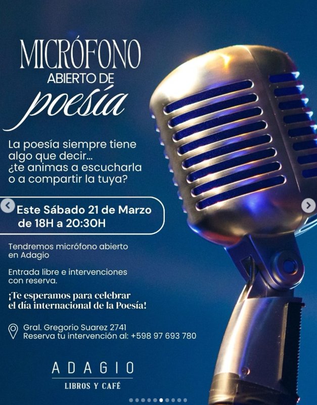 Tendremos micrófono abierto en Adagio Entrada libre e intervenciones con reserva. Reserva tu intervención al: +598 97 693 780 ¡Te esperamos para celebrar el día internacional de la Poesía!