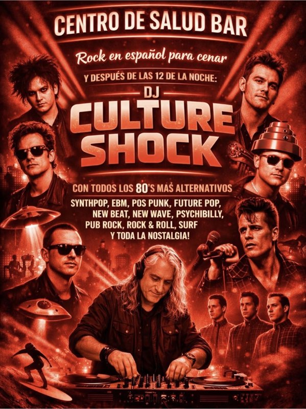 Los sábados no son para quedarse en casa. Son para perderse. En Centro de Salud Bar la noche empieza suave... rock en español para cenar, cantar y abrir la herida. Y después de la medianoche... se desata todo. 'S DJ CULTURE SHOCK toma el control y dispara directo a la memoria: Synthpop. EBM. Post punk. New wave. Future pop. Psychobilly. Surf. Rock & roll. Y todos esos himnos que no envejecen... solo se vuelven más peligrosos. Una pista. Luces bajas. Cuerpos que recuerdan. Esto no es solo música. Es nostalgia con pulso. Después de las 00:00: la verdadera historia comienza