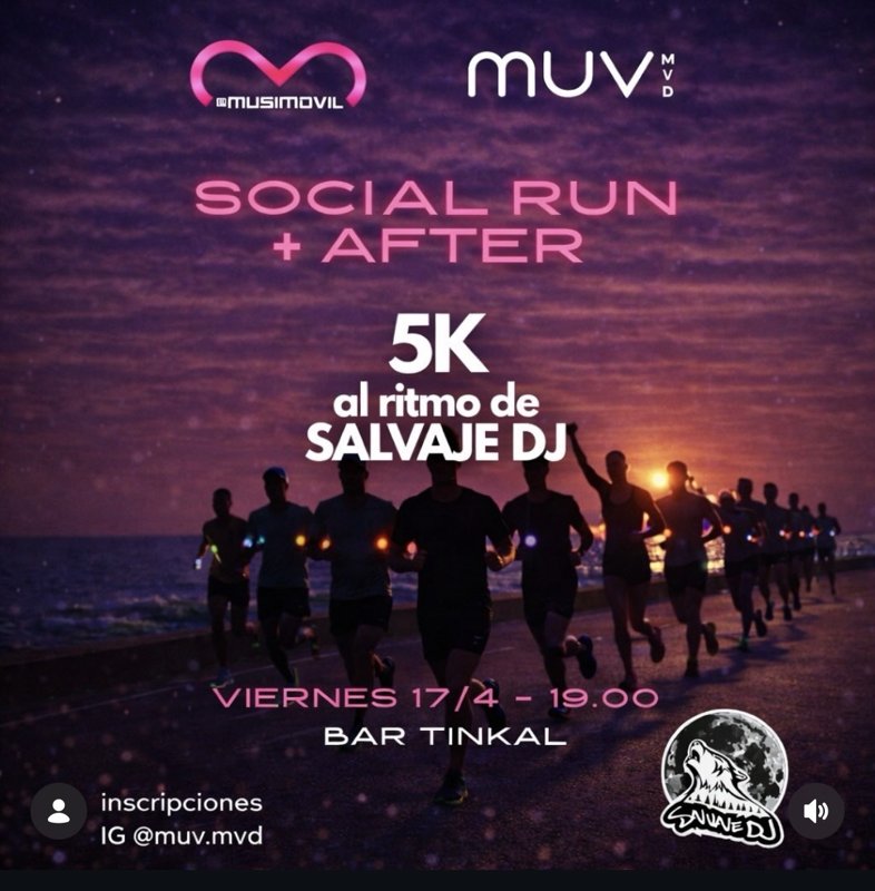 Social Run + After Muv Mvd se une con Musimóvil y Salvaje DJ para armar una verdadera fiesta del running Arrancamos con una entrada en calor y salimos a correr 5K al ritmo de Salvaje DJ Parada en Rambla del Golf y vuelta a Tinkal para cerrar con tremendo after Traé lucecitas y sumate a iluminar la noche Aporte voluntario sugerido: $250 OCA BLUE 7686527 (Sofía Chelle) ¡Nos vemos para correr, bailar y disfrutar juntos!