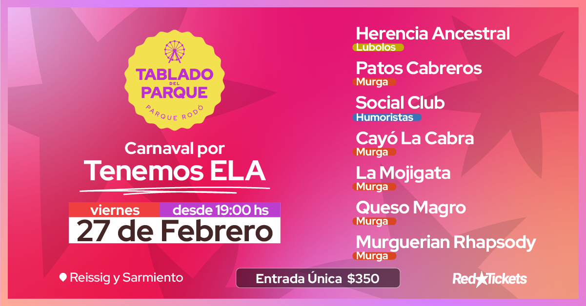 CARNAVAL POR LA ELA Viernes 27 de Febrero desde las 19hs. ENTRADA UNICA: $350 Si no podes/queres asistir pero queres colaborar tenes la opcion de los bono colaboracion por $100, $300 y $500: Con la compra del bono colaboracion estas aportando dinero sin adquitir una entrada lo que nos permiten dejar el lugar libre para quienes quieren asistir. muchas gracias por sumarte ACTUARAN: Herencia Ancestral Patos Cabreros Social Club Cayó La Cabra La Mojigata y mas...