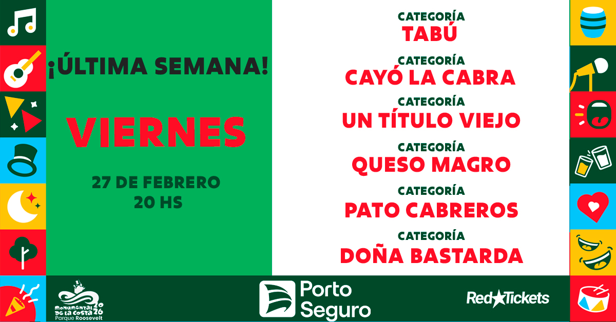 EN CASO DE SUSPENSIÓN POR LLUVIA SE DEBE REALIZAR EL CAMBIO PARA OTRA FECHA DE CARNAVAL. NO SE REALIZAN DEVOLUCIONES. Niños menores de 11 años inclusive no abonan entrada (un menor por mayor).