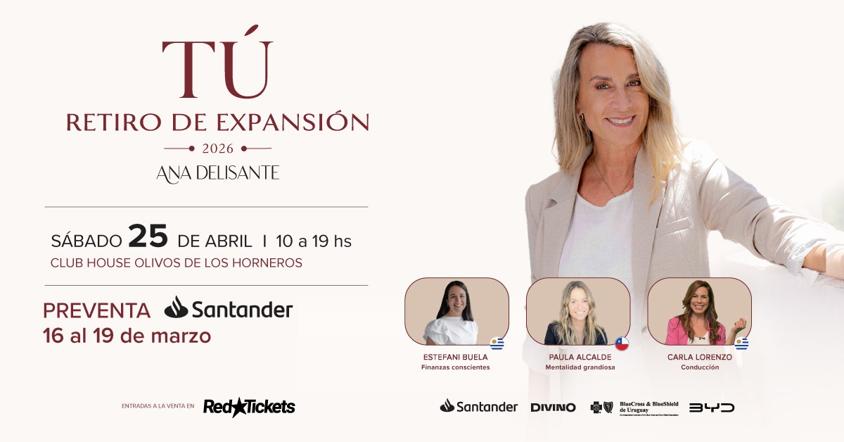 TÚ es un retiro inmersivo de todo el día, creado y liderado por Ana Delisante, pensado para mujeres profesionales y emprendedoras que quieren trabajar en su crecimiento personal y profesional. Es una jornada de transformación, liderazgo y expansión personal y profesional, donde se integran identidad, mentalidad, marca personal, finanzas conscientes y toma de decisiones estratégicas en un entorno natural premium. Acreditaciones y entrega de kits 9:00 a 10:00 hs Horario del retiro 10:00 a 19:00 hs Lugar : Club House Olivos de los Horneros Speakers del evento: • Ana Delisante – Marca personal y liderazgo • Paula Alcalde (Chile) – Mentalidad Grandiosa • Estefani Buela – Finanzas conscientes Conducción general : Carla Lorenzo El evento tendrá dos tipos de ticket: RETIRO DAY PACK Experiencia completa del retiro de 9:00 a 19:00 hs. Incluye : • Acceso completo al retiro • Acceso a los dos salones del evento • Participación en todas las conferenci